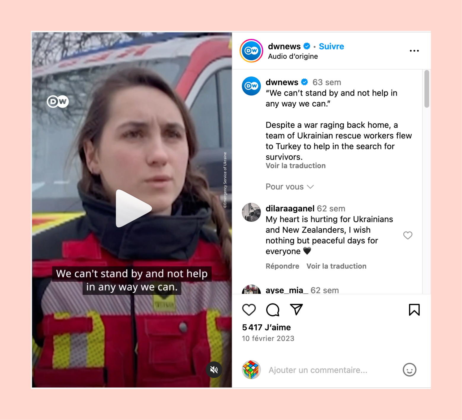 2. Produisez des histoires humaines puissantes : La Deutsche Welle a publié une vidéo incroyable montrant des secouristes ukrainiens après le tremblement de Terre en Turquie. Le New York Times a eu la même approche avec un article sur un club de natation israélo-palestinien.