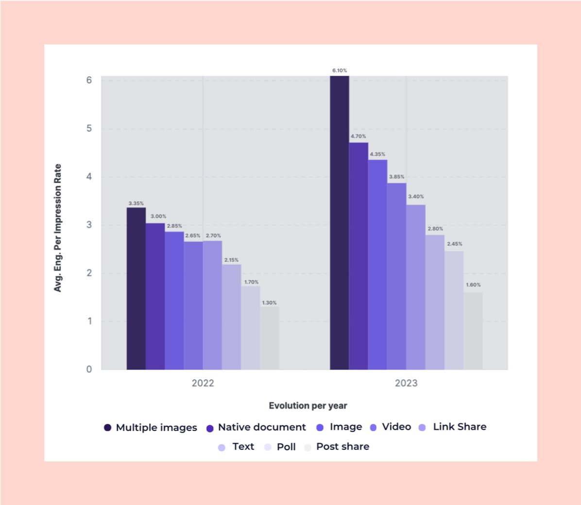 Il atteint 3,84% en 2024 en moyenne pour les posts de pages (bien plus faible que pour les comptes perso). Le type de format qui fonctionne le mieux est le carousel d’images avec un taux de 6,10% en moyenne. Mais les vidéos sont les contenus les plus partagés (4 par post en moyenne)