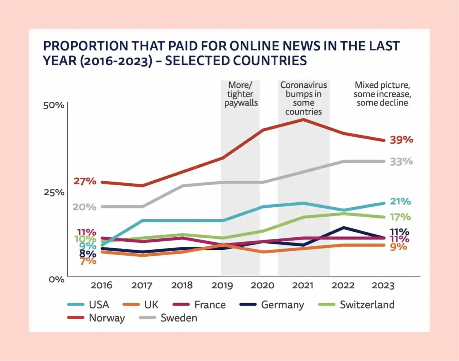1. Ce n’est pas nouveau, les médias sont pris en étau par une chute de leurs revenus de tous les côtés : publicité, ventes, petites-annonces… Les abonnements numériques payants peinent à décoller sauf pour une poignée d‘éditeurs. Les géants du web récupèrent la majorité de la valeur publicitaire (52% en 2022 et sans doute 65% à horizon 2030).
