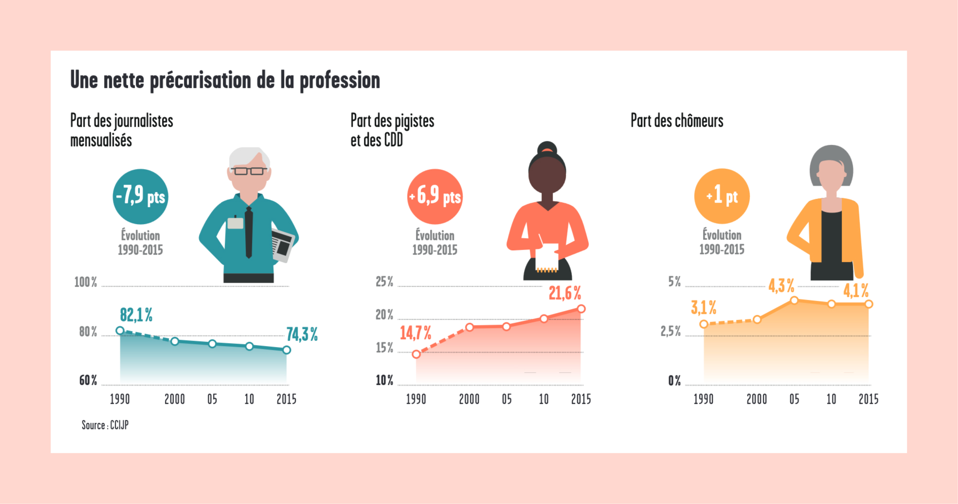 C’est ce que rappelle le sociologue Jean-Marie Charon qui a interrogé une centaine de jeunes journalistes, depuis 2021 et publié “Jeunes journalistes, l’heure du doute”. Il fait référence au chiffre de cette vaste étude de l’IFP de 2017 (pdf). Cause principale : la précarisation en hausse.