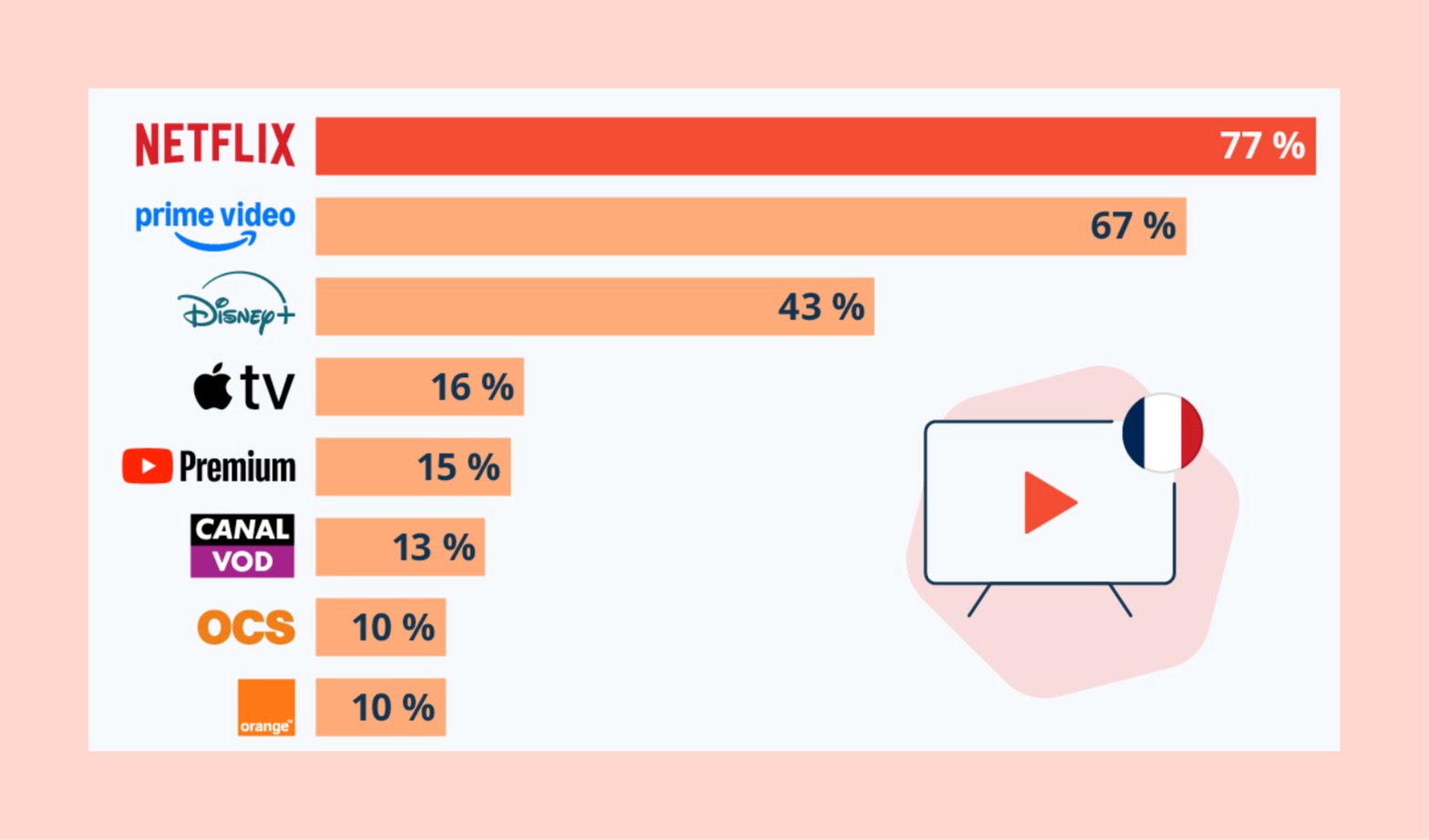 Netflix reste la plateforme la plus populaire en France (77% des consommateurs de streaming payant), mais Amazon Prime n’est pas si loin (67%). Disney n’est qu’en 3e position avec 43% d’usagers payants.