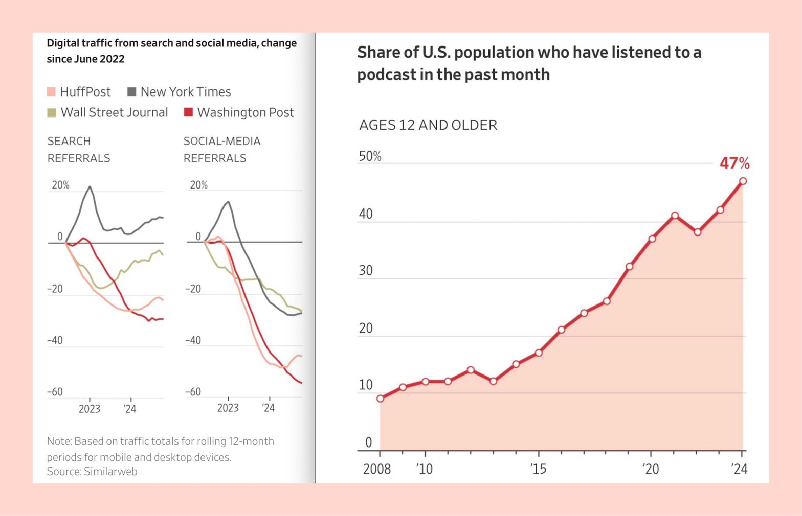 Le Washington Post a étudié (via Similarweb) l’évolution du trafic social et search de grands sites d’info américains depuis 2022. La chute est spectaculaire. Autant que l’essort de l’usage des podcasts.