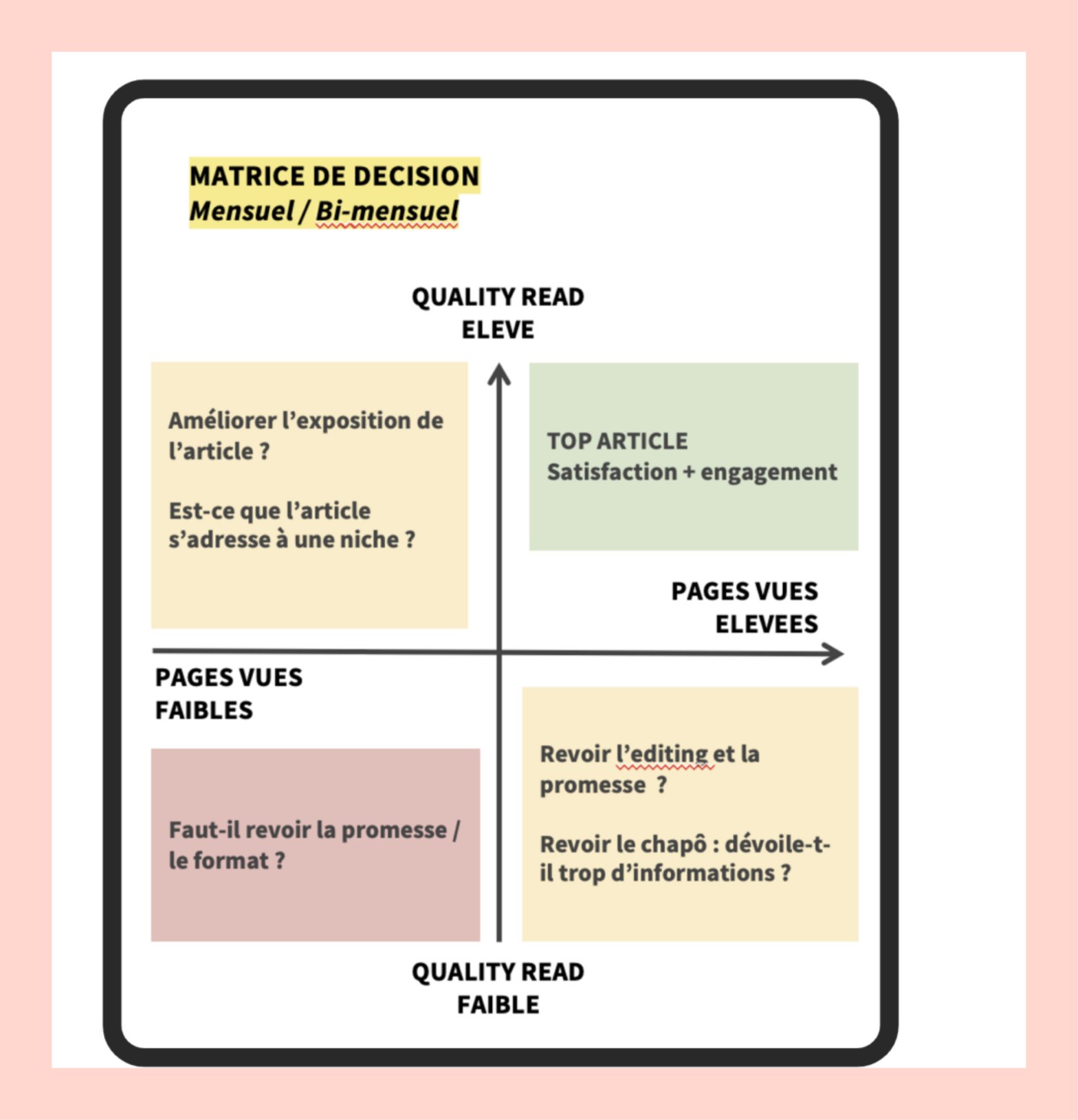 Utilisez des indicateurs comme l’indice RFV (récence, fréquence, volume) pour mesurer l’intérêt des lecteurs. L’Equipe ajuste cet indice en intégrant des valeurs sociétales (pour ne pas sabrer trop vite les fameux articles fantômes). Les Echos eux, ont créé leur propre panel (4000 personnes) qu’ils interrogent pour adapter leurs produits. Ils mesurent aussi la profondeur de lecture grâce à un tracker qui évalue le défilement des pages et le temps passé. Ce, pour modifier l’édition des articles en temps réel ou améliorer les formats à long terme.