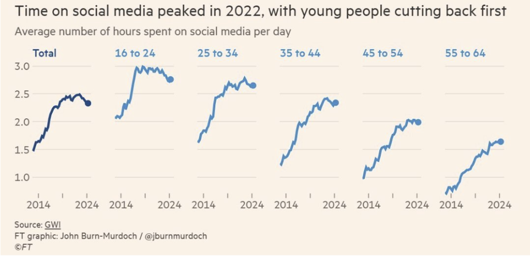 Pour la première fois, le temps passé sur les réseaux sociaux diminue, surtout chez les jeunes, selon un graphique du Financial Times commenté par Greg Isenberg. Lassés du flux infini de contenus artificiels et des algorithmes standardisés, ils se tournent vers des expériences plus lentes et authentiques, favorisant les formats “slow media”, les communautés de confiance et les événements physiques. Ce basculement illustre une fatigue numérique et une quête de sens qui touchent directement les médias. Pionniers du désengagement social, ces utilisateurs redéfinissent l’attention et les modèles de contenu : l’ère du scroll infini laisse place à celle du temps bien investi, des formats incarnés et des interactions à forte valeur ajoutée.