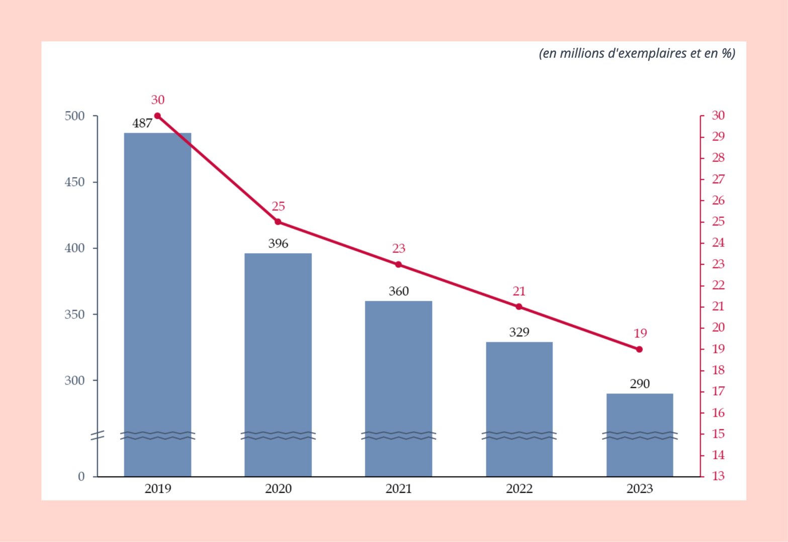 Entre 2019 et 2023, les ventes au numéro de la PQN ont chuté de 60 % et celui de la presse régionale (PQR) de 36 %. L'érosion constatée sur la seule année 2023 est de 14 % pour la PQN et 11 % pour la PQR.