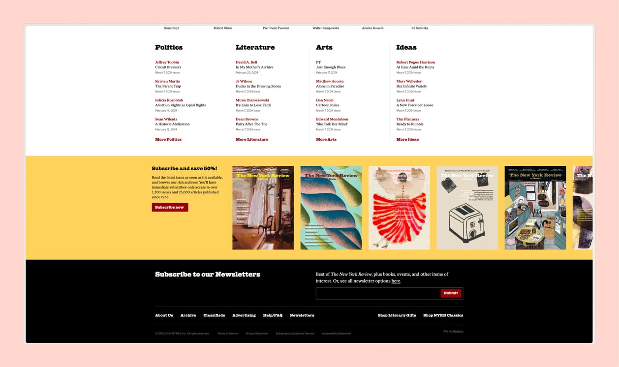 Aujourd’hui on évoque la revue culturelle bimensuelle The New York Review of Books. La revue a mis en place un carousel pour mettre en avant son édition papier dont les couvertures sont remarquables par la qualité des illustrations, peintures et autres photographies.